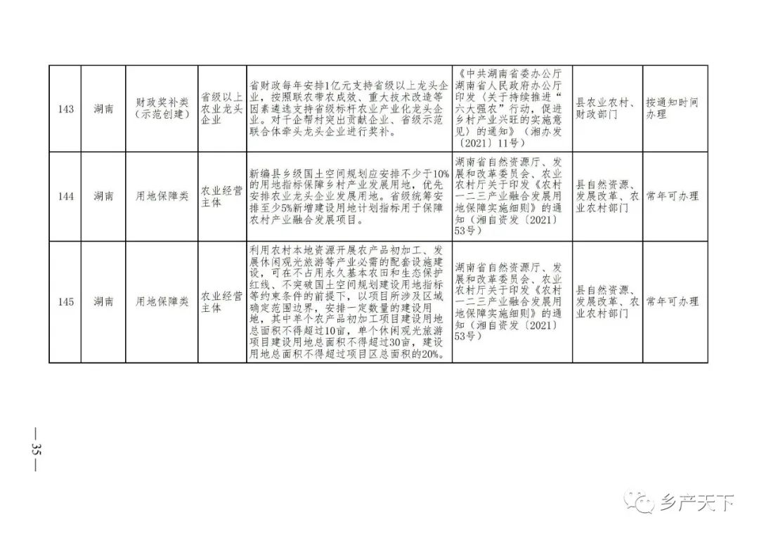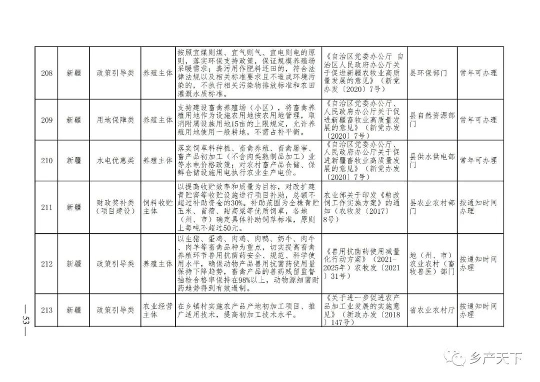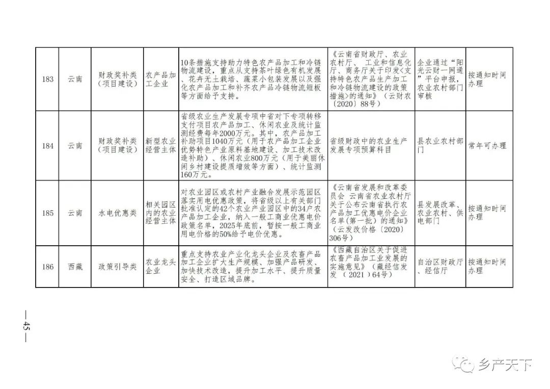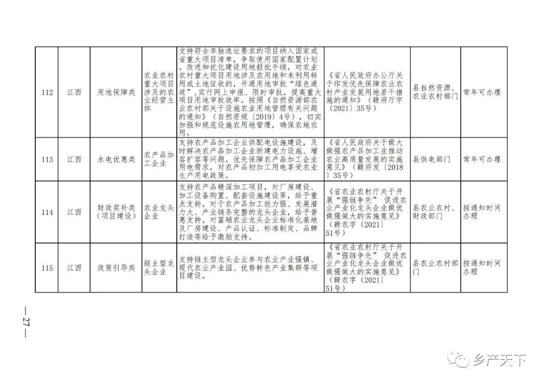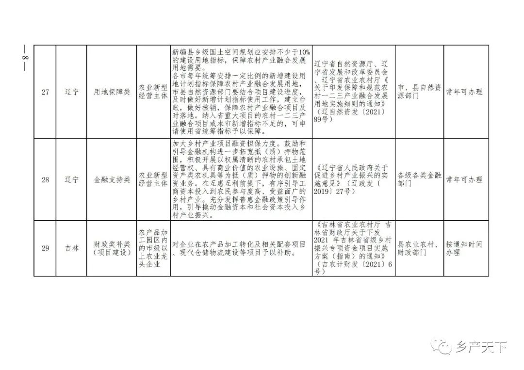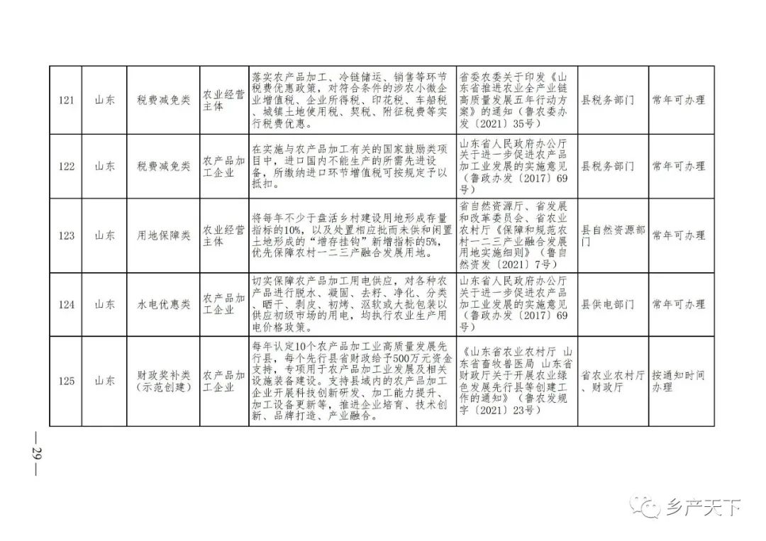 《清單》按照“政策類別、支持對(duì)象、具體內(nèi)容、政策依據(jù)、辦理部門、辦理時(shí)間”進(jìn)行梳理,共涉及“財(cái)政獎(jiǎng)補(bǔ)、金融支持、用地保障、稅費(fèi)減免、水電優(yōu)惠、政策引導(dǎo)”等六大類229條政策。《清單》通知,各地支持政策發(fā)生變化,要及時(shí)反饋,鄉(xiāng)村產(chǎn)業(yè)發(fā)展司將定期更新發(fā)布。