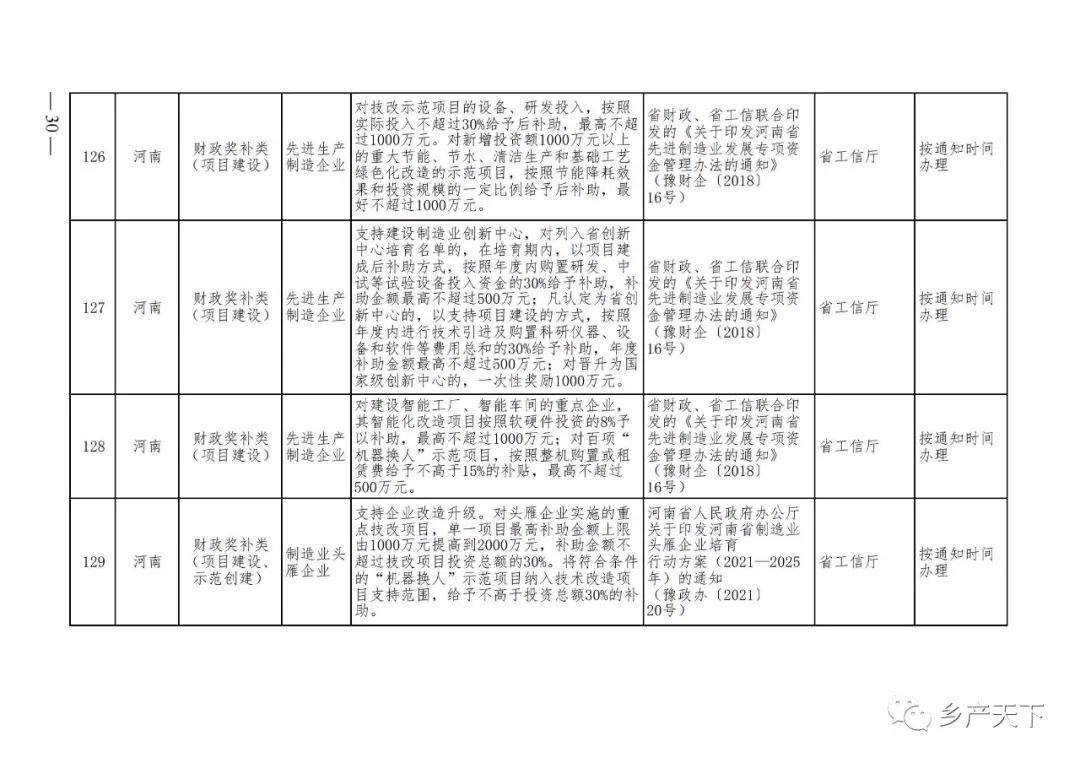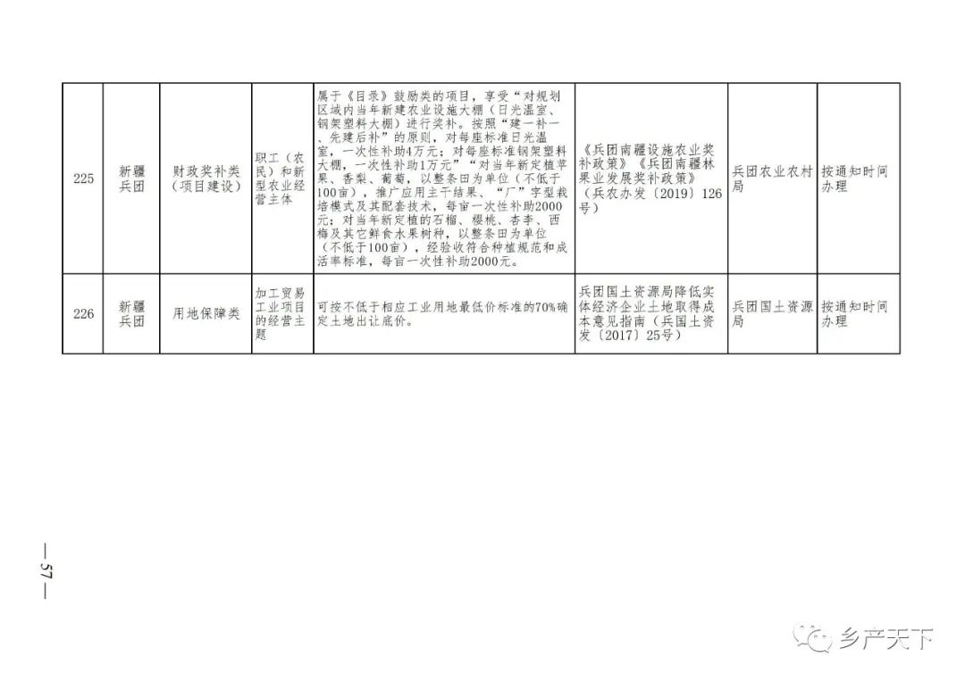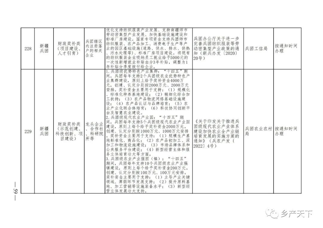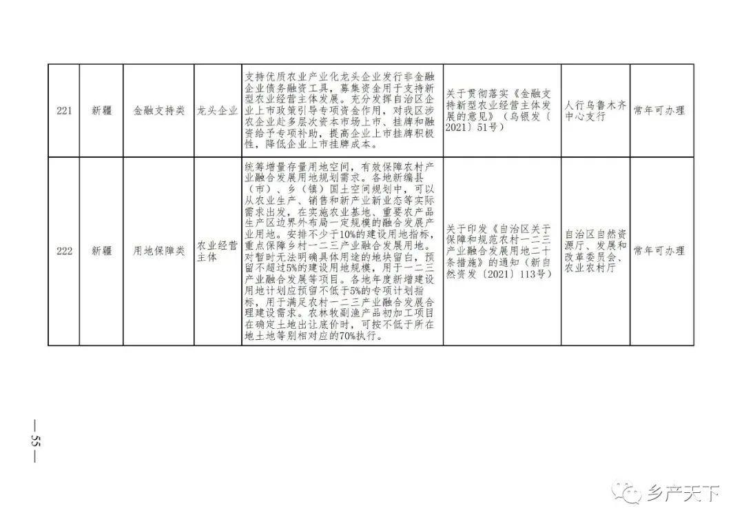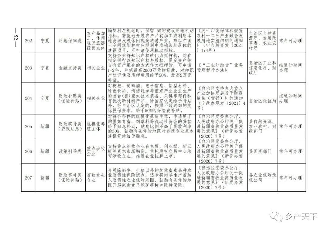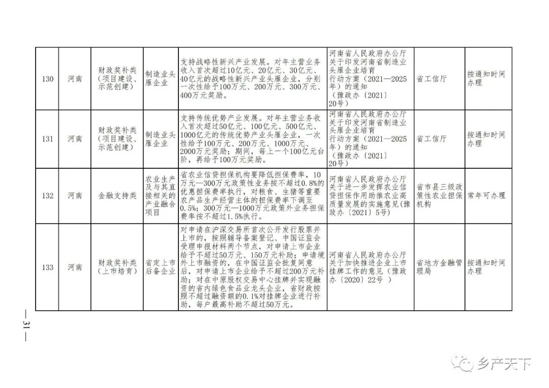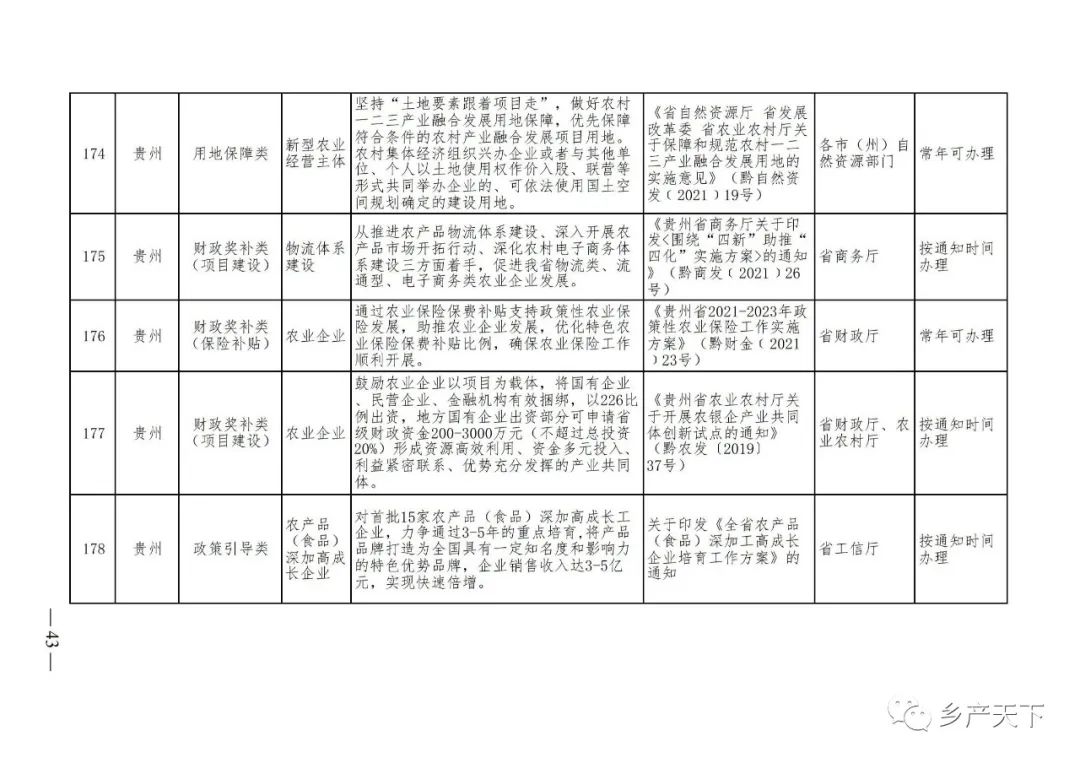 《清單》按照“政策類別、支持對(duì)象、具體內(nèi)容、政策依據(jù)、辦理部門、辦理時(shí)間”進(jìn)行梳理,共涉及“財(cái)政獎(jiǎng)補(bǔ)、金融支持、用地保障、稅費(fèi)減免、水電優(yōu)惠、政策引導(dǎo)”等六大類229條政策。《清單》通知,各地支持政策發(fā)生變化,要及時(shí)反饋,鄉(xiāng)村產(chǎn)業(yè)發(fā)展司將定期更新發(fā)布。